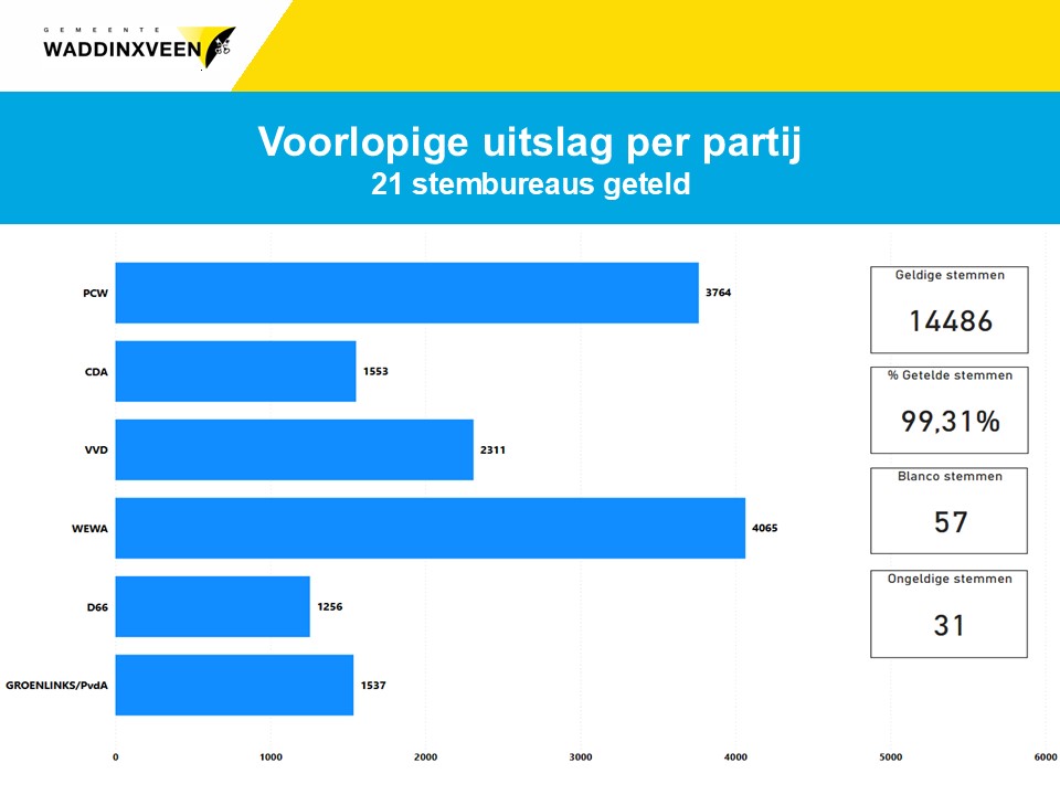 De gemeenteraadsverkiezingen zijn afgelopen, de stembureaus zijn gesloten. In onderstaande tabel staan de tussentijdse opkomst cijfers van de gemeenteraadsverkiezingen. Het totaal aantal kiesgerechtigden in de gemeente Waddinxveen is: 26.792.